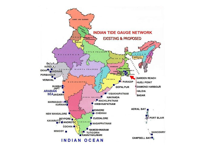 Geodetic & Research Branch has installed Survey of India patterns Tide Gauges, Acoustic Tide gauges and Pressure Sensor Tide Gauges along the Indian coast at various Major and Minor ports of India .