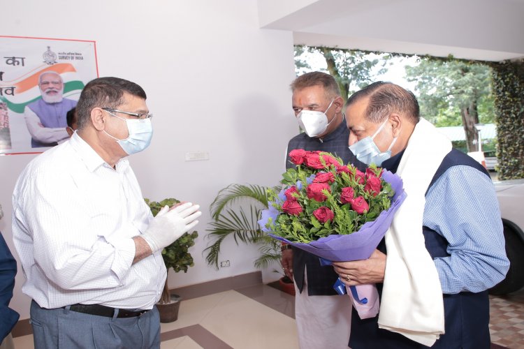 Dr. Jitendra Singh Hon'ble Minister S&T Welcomed by Shri Naveen Tomar SGI on his visit to SOI Head Quarter, Dehradun